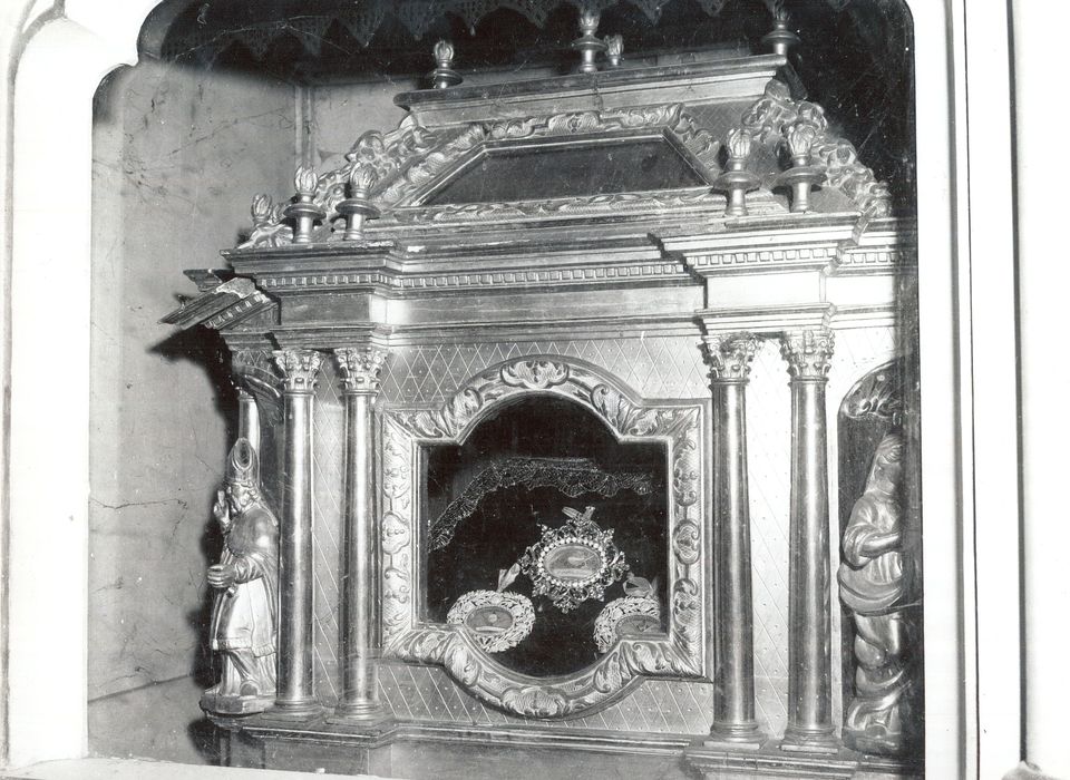 Châsse-reliquaire en bois sculpté et doré avec statuettes.