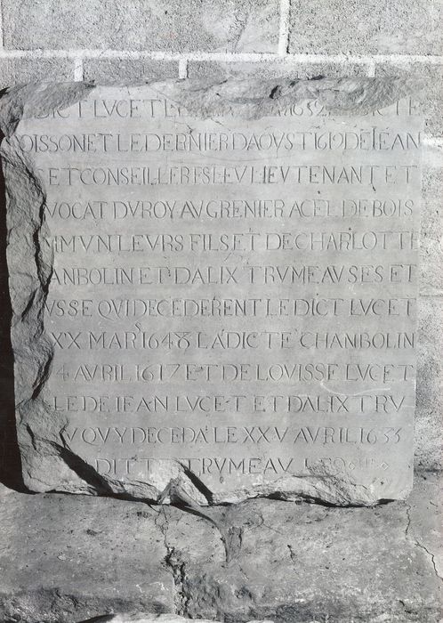 Epitaphe : (..) LUCET (...) OISSONET LE DERNIER DAUVST 1619 DE IEAN (...) ET CONSEILLERES LEV LIEVTENANT ET (...) VOCAT DV ROY AV GRENIER ACEL DEBOIS (...) MMVNLEVRS FILS ET DE CHARLOTTE (...) ANBOLIN ET DALIX TRVMEAVSES ET (...) VSSE QVI DECEDERENT LE DICT LVCET (...) XX MARS 1648 LADICTE CHANBOLIN 4 AVRIL 1617 ET DE LOVISSE LVCET (...) LE DE IEAN LVCET ET DALIX TRV (...) VQVY DECEDA LE XXV AVRIL 1633 (...) DIT (...) TRVMEAV (...).
