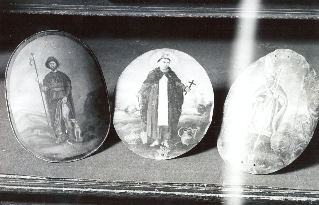 POP | Plateforme ouverte du patrimoine12 panonceaux de cierge (panneaux de protection de porte-cierge) : Saint Roch et saint Fiacre