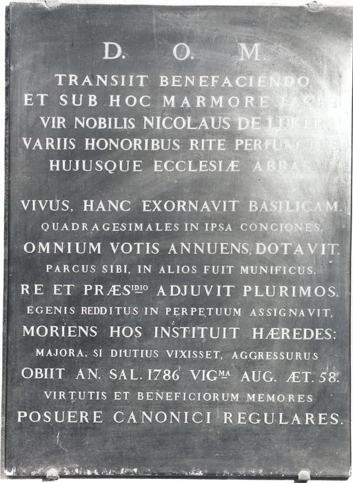 Epitaphe : D.O.M TRANSIIT BENEFACIENDO ET SUB HOC MARMORE JACET VIR NOBILIS NICOLAUS DE LUKER, VARIIS HONORIBUS RITE PERFUNCTUS, HUJUSQUE ECCLESIAE ABBAS. VIVUS, HANC EXORNAVIT BASILICAM. QUADRAGESIMLES IN IPSA CONCIONES, OMNIUM VOTIS ANNUENS, DOTAVIT. PARCUS SIBI, IN ALIOS FUIT MUNIFICUS. RET ET PRAESidio ADJUVIT PLURIMOS. EGENIS REDDITUS IN PERPETUUM ASSIGNAVIT, MORIENS HOS INSTITUIT HAEREDES : MAJORA, SI DIUTUIS VIXISSET, AGGRESSURUS OBIIT AN. SAL. 1786 VIGma AUG. AET. 58. VIRTUTIS ET BENEFICIORUM MEMORES POSUERE CANONICI REGULARES.