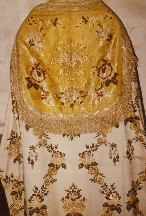 Damas blanc brodé de soies polychromes ; rabat en tissu lamé et damassé or à décor polychrome, fils or et argent.