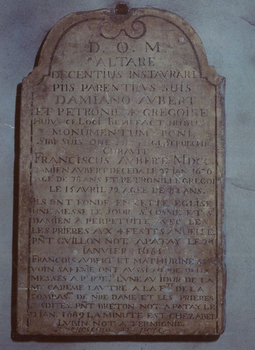Inscription : D.O.M. / ALTARE / DECENTIUS INSTAURARI / PIIS PARENTIBUS SUIS / DAMIANO AUBERT / ET PETRONILLA GREGOIRE / HUIS CE LOCI BENEFACTORIBUS / MONUMENTUM PONI / SIBI SUIS ONE[illisible] SEPULCHR / CURAVIT / FRANCISCUS AUBERT MDCC / DAMIEN AUBERT DECEDA LE 27 JAN 1676 / AGE DE 78 ANS ET PETRONILLE GREGOIRE / LE 15 AVRIL 79 AGEE DE 82 ANS. / ILS ONT FONDE EN CETTE EGLISE / UNE MESSE LE JOUR ST COSME ET ST / DAMIEN A PERPETUITE AVEC / LES PRIERES AUX 4 FESTES ANUELLE. / PNT GUILLON NOT. A PATAY LE / JANVIER 1681 / FRANCOIS AUBERT ET MATHURINE SER / VOIN SA FEMME ONT AUSSI FONDE DEUX / MESSES A PRPTE. L'UNE AU JOUR DE LA / MI CAREME L'AUTRE A LA FTE DE LA / COMPAON DE NRE DAME ET LES PRIERES / SUSDITES PNT BRETON NOT. A PATAY LE / 12 JAN. 1689 LA MINUTE EST CHEZ ABEL / LUBIN NOT. A TERMIGNIE