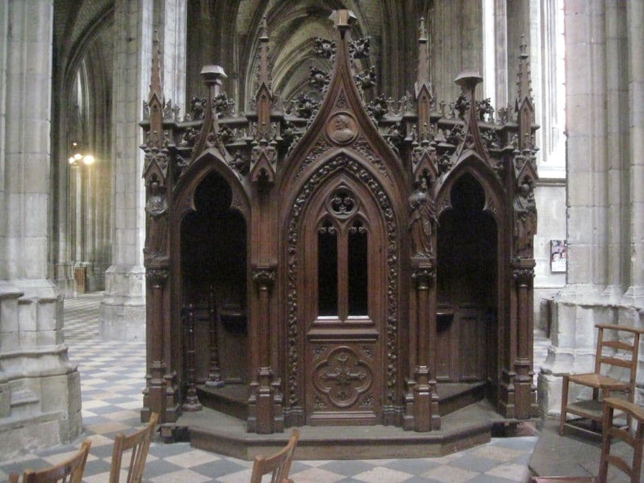 Confessionnal de style néo-gothique en chêne massif avec traces de polychromie, à deux places. Il ouvre par des portes libres en arc brisé, couronnées par des gâbles garnis de crochets et amortis d'une statuette d'ange sur les côtés, et de saint Georges au centre. La porte centrale présente un vantail richement sculpté, orné d'une croix et ajouré d'un réseau dans la partie supérieure. Dans le gâble, médaillon à l'effigie de Mgr Dupanloup. Les pilastres accostant les portes sont agrémentés d'une colonnette supportant des statuettes de saints.