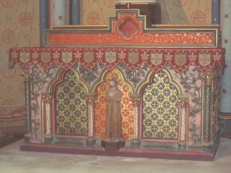 Autel néogothique contemporain du décor mural de la chapelle et formant un ensemble avec celui-ci. A conservé sa statue de saint François d'Assise d'origine. Une petite statue de saint François est placée à l'avant de l'autel, dans la niche centrale.