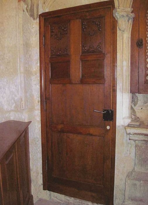 Porte comprenant 2 panneaux de lambris du 17e siècle, sculptés du même motif de la croix sur le Golgotha, portant la couronne d'épines, de nuées aux angles et de la main bénissant (emblème du Chapitre d'Orléans) dans l'angle supérieur droit.