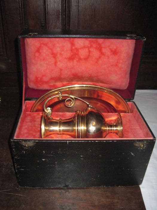 Aiguière (0.33) et bassin (0.34) dans leur boîte. Bassin ovale peu profond. Aiguière sans couvercle, à anse à enroulement médian et entrelac, terminée par une feuille ; panse à étranglement sous l'épaule. Conservé dans sa boite cartonnée.