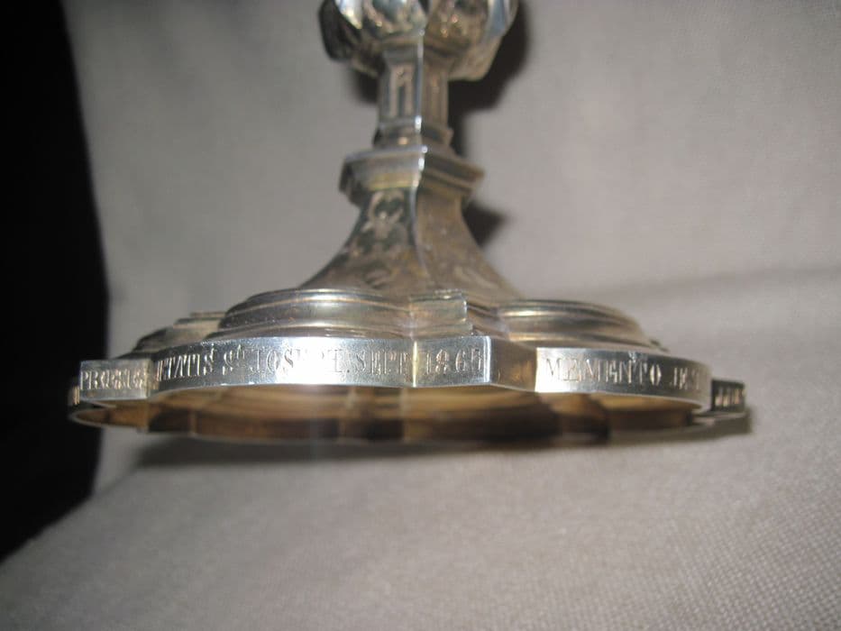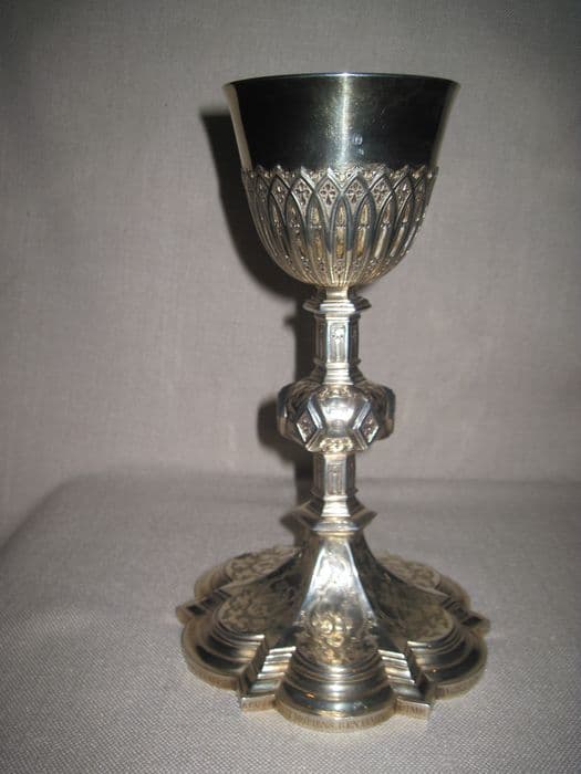 Calice de style néo-gothique, à pied hexalobé et à gradins, noeud aplati et fausse coupe découpée et repercée. Il est orné sur le pied des instruments de la Passion, sur le noeud de pointes de diamants creusés d'un quadrilobe ; sur la fausse coupe de fenestrages.