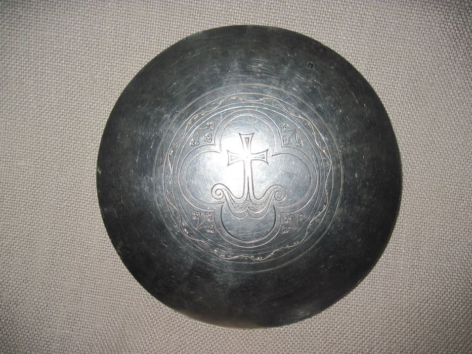 Patène de style néogothique ornée au revers d'un motif ciselé de croix pattée au pied en volutes inscrite dans un quadrilobe ; sur le pourtour de la cuvette au revers, motifs de fleurettes, de vagues et de cercles concentriques en pointillés.