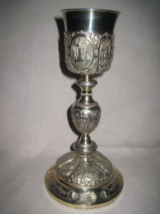 Calice à fausse coupe découpée et repercée, orné sur le pied de la Nativité, ; du Christ au Mont des Oliviers et de la Crucifixion séparés par des pampres, épis de blé et roseaux. Sur le pied, le Sacré Coeur, la Trinité et les tables de la Loi. Sur la fausse coupe, les instruments de la Passion dans des médaillons séparés par des pampres, épis de blé et roseaux.