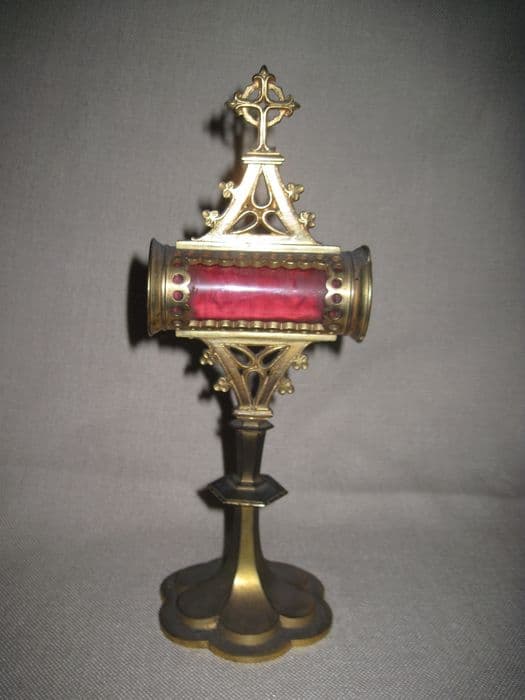 Laiton, velours. Reliquaire de style néogothique, sur un pied polylobé, orné d'un noeud plat hexagonal ; le réceptacle à reliques est de forme cylindrique, allongée. La relique elle-même est un fragment de bois fixé à un petit panneau couvert de velours cramoisi.