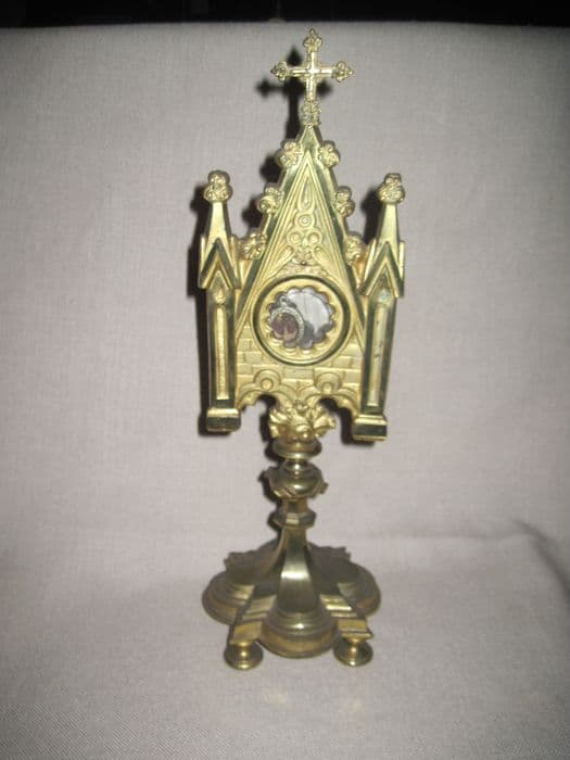 laiton, verre, papier, tissu etc (pour les reliques). Reliquaire de style néogothique, sur un pied quadrilobé reposant sur quatre petits pieds-bobine, orné d'un noeud plat circulaire à cabochons losangés ; le réceptacle à reliques est de forme circulaire à fenêtre polylobée ; il est inclus dans un encadrement à motifs de gables et de pinacles. Les reliques sont incluses dans des petits pendentifs et sont relatives à la vraie Croix, au sepulum, et à Marie- Madeleine Alacoque.