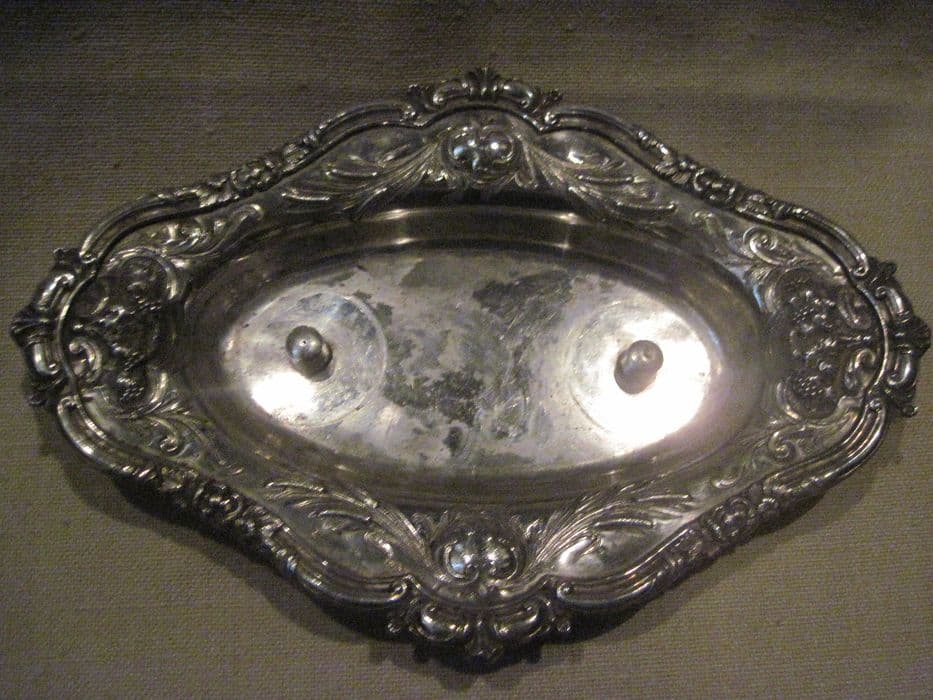 Plateau à bords chantournés de style Louis XV, orné sur l'aile de pampres et de médaillons accostés de roseaux, frappés des lettres M.R. Sous le plateau : Bachelier à Paris. Description des burettes manquantes : ornées sur la panse de roseaux accostant un médaillon figurant la Vierge d'une part, et d'autre part le Christ. Anse sinueuse, couvercle décoré de pampres et d'un coquillage (source : Guilbaud).