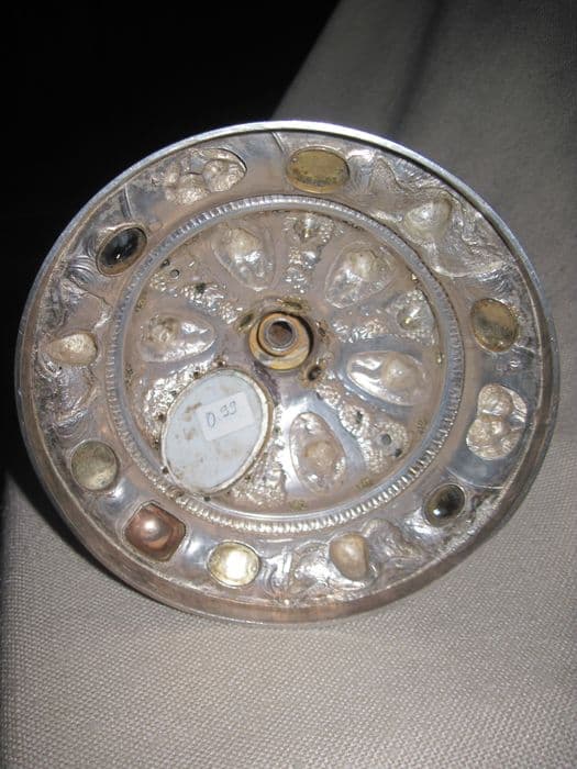 argent : doré ; verre (coloré) : taillé en cabochon ; émail