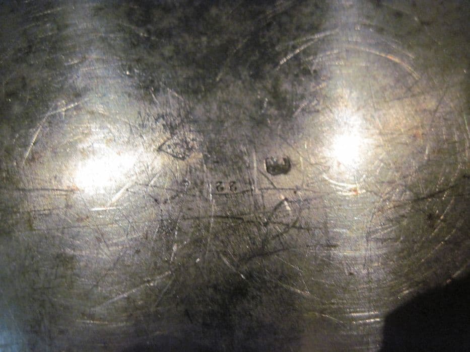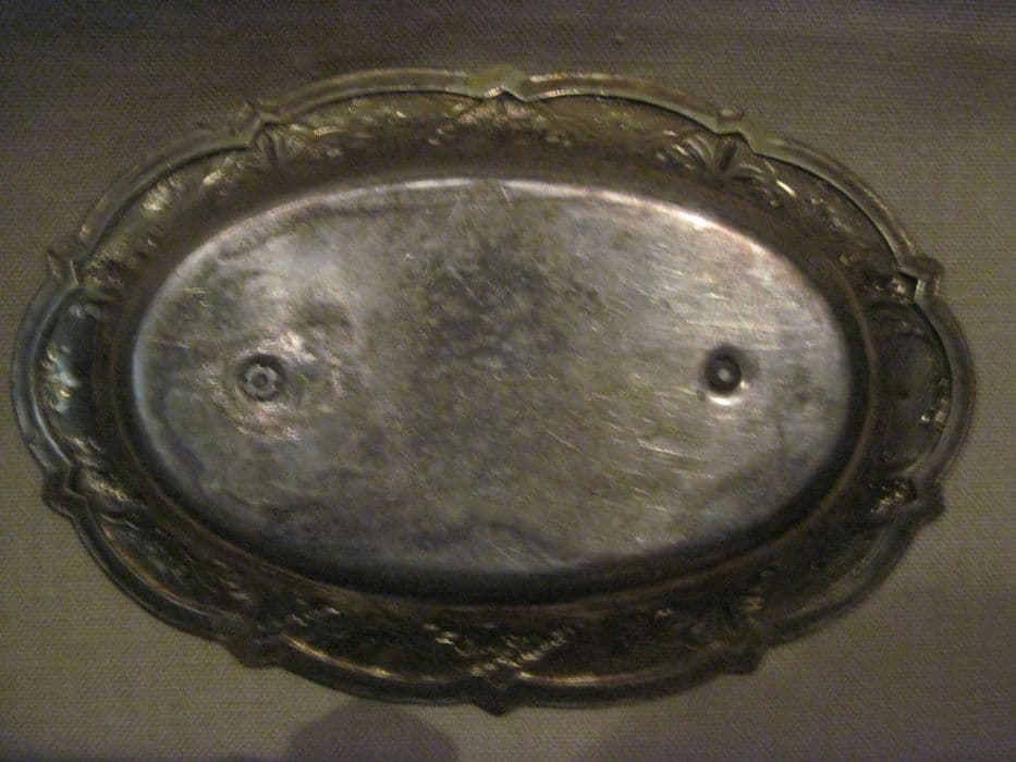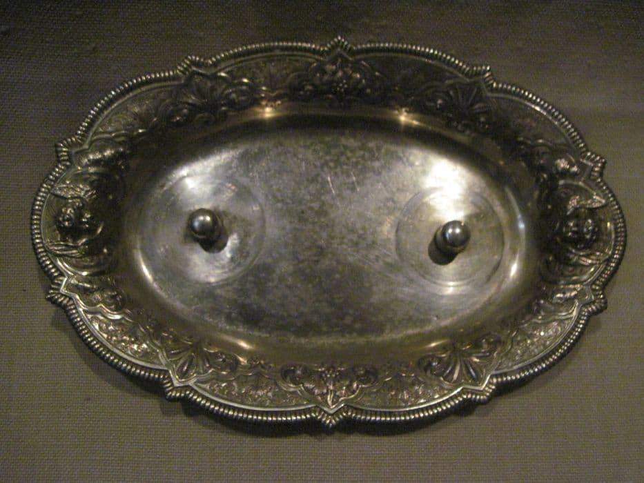 Plateau à burettes à silhouette polylobée ; les bords sont godronnés ; aux extrémités, deux têtes d'angelots ; sur l'aile, des cartouches faisant alterner roseaux et pampres de vignes, sur fond de fleurs de lys amaties feuillagées.