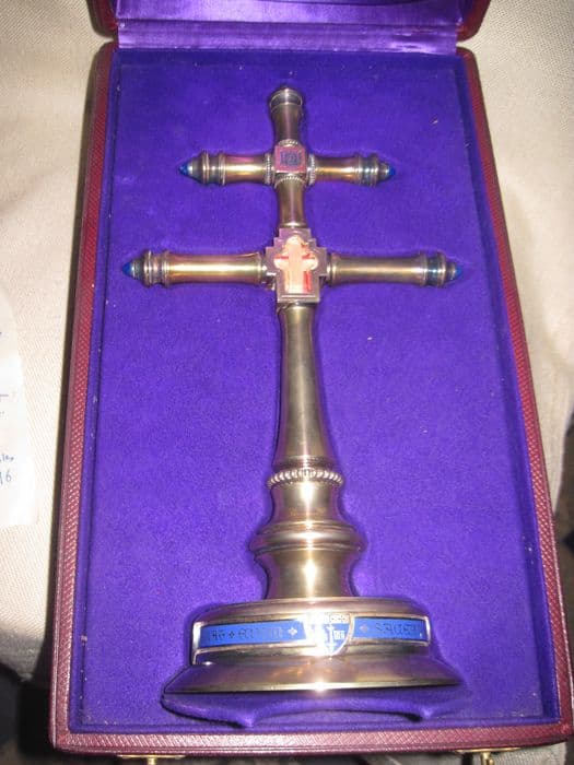 Croix archiépiscopale, dans sa boîte, de section circulaire. Elle est ornée de perles au-dessus du pied et à l'intersection de la seconde traverse ; frappée d'un carré à fond émaillé rouge présentant le voile de sainte Véronique d'un côté et de l'autre une fleur, d'une capsa à l'intersection de la première traverse, à ouverture trilobée, contenant sur un fond de tissu rouge deux éléments de bois formant croix surmontant un petit cartel de papier. Les extrémités des branches sont ornées de bobèches se terminant par un cabochon de verre bleu. Dans sa boite d'origine.
