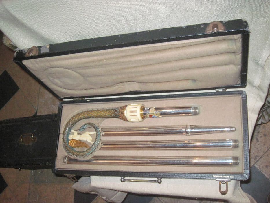 Crosse de style néogothique dans sa boîte en 4 éléments. Laiton argenté (hampe), laiton doré (noeud), laiton patiné (volute) ; laiton nickelé (bouclier) ; ivoire (noeud, saint Michel) ; émail (armoiries).