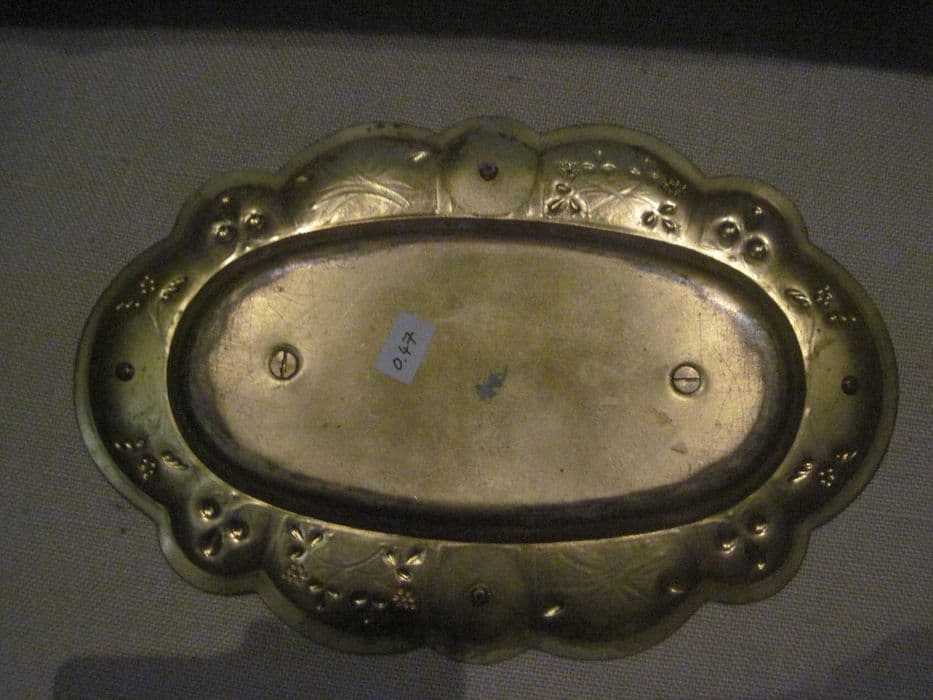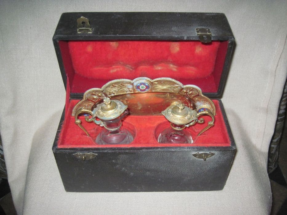 Plateau et burettes dans leur boîte. Plateau polylobé orné sur l'aile de quatre médaillons émaillés à décor de quadrilobes et de pampres et roseaux. Burettes à récipient en verre gravé à l'acide de pampres, à anse en forme d'enroulement feuillagé et couvercle terminé par un fretel.