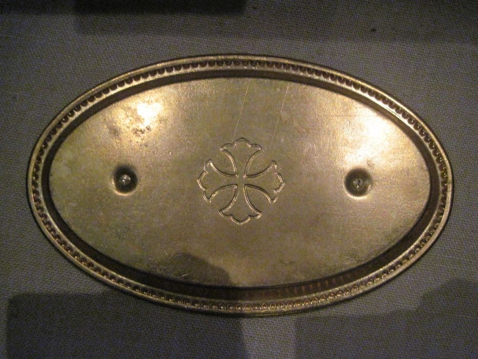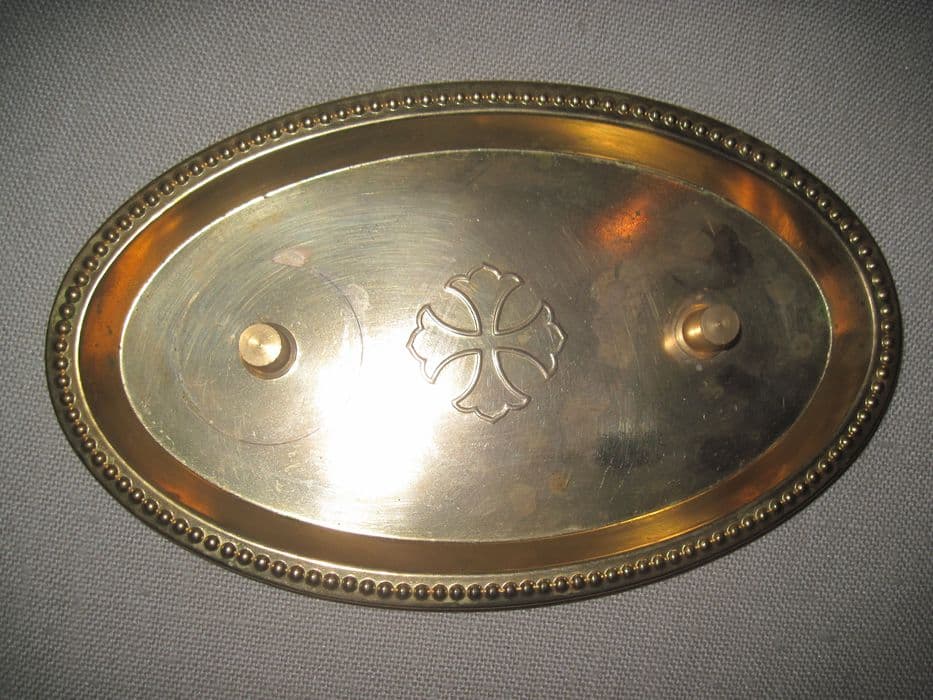 Plateau à burettes à décor de rang de perles sur le pourtour et de croix pattée et tréflée au centre. Les burettes sont manquantes.