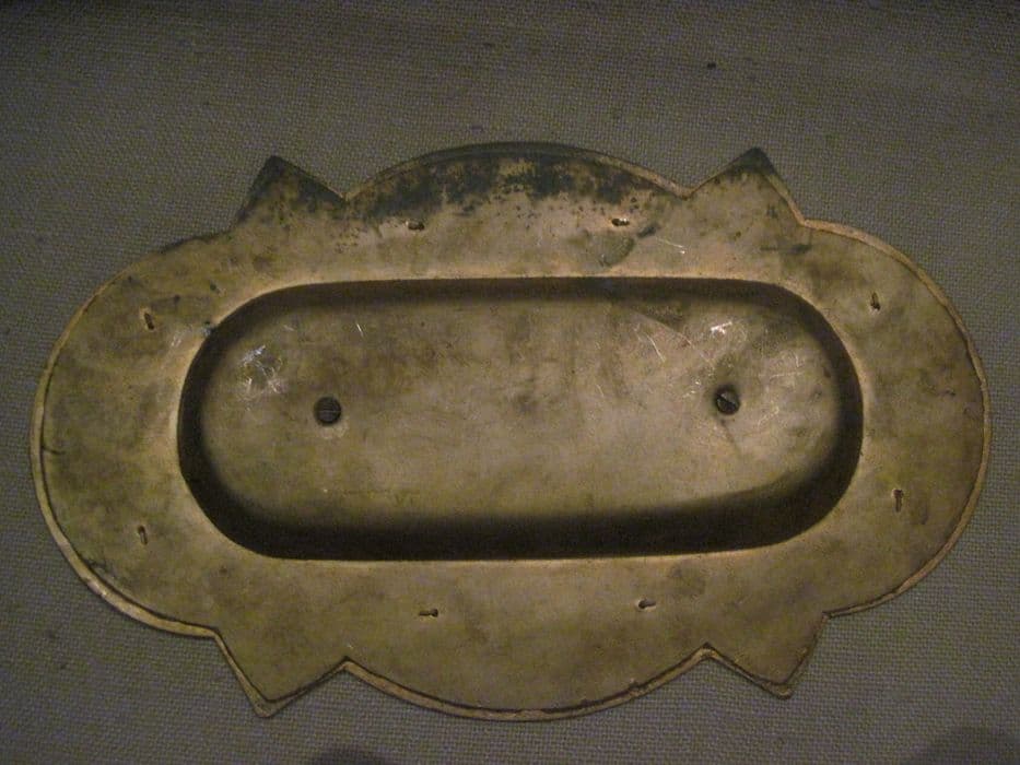 Plateau à burettes au pourtour découpé alternant lobes et pointes soulignés d'un rang de perles ; au milieu des côtés, motif rapporté de rinceaux encadrant des fleurs à huit pétales. Les burettes sont manquantes.