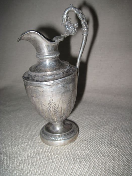 Métal blanc. Burette à anse feuillagée s'achevant en corne d'abondance, motifs de rangs de feuilles sur le pied, la base et l'épaule, motif de corde autour du col.