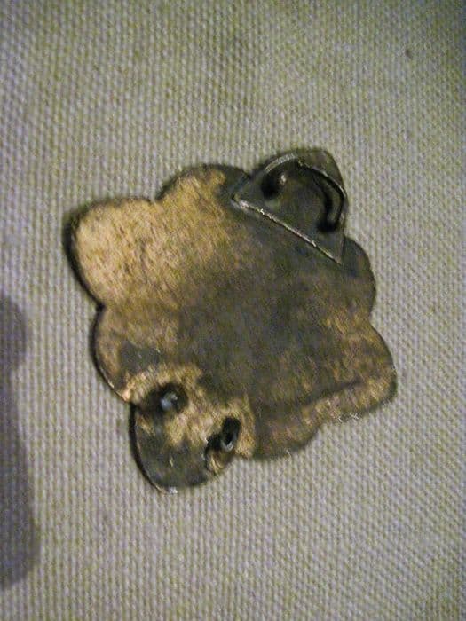 Écusson polylobé de forme losangée figurant l'agneau auréolé. Au revers, deux anneaux de fixation dont un cassé.