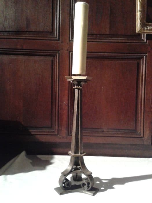 Ensemble de 6 flambeaux en fer forgé, à pied tripode en volutes.