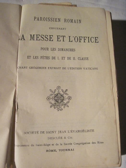 livre liturgique : Paroissien romain. Chant grégorien. N° 801. Paroissien romain contenant la messe et l'office pour les dimanches et les fêtes de I. et de II. Classe. Chant grégorien extrait de l'édition vaticane.