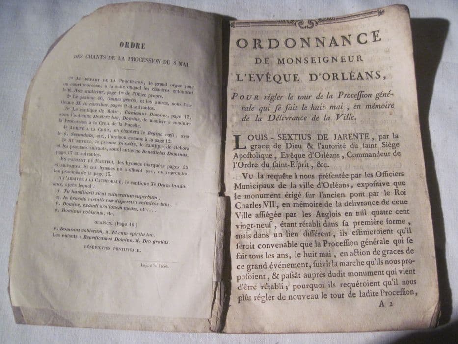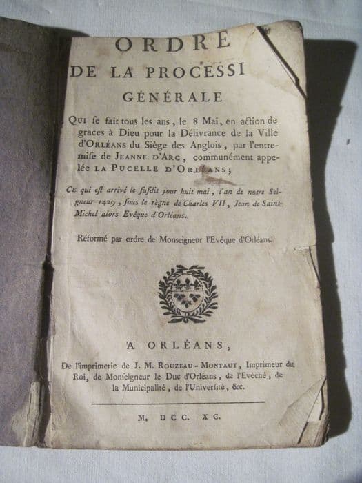 livre liturgique : Ordre de la procession générale qui se fait tous les ans le 8 mai, en action de graces à Dieu pour la délivrance de la ville d'Orléans du siège des Anglois, par l'entremise de Jeanne d'Arc, communément appelée la pucelle d'Orléans [ ] Réformé par ordre de Monseigneur l'évêque d'Orléans, introduit par l'Ordonnance de Monseigneur, évêque d'Orléans, pour régler le tour de la procession.