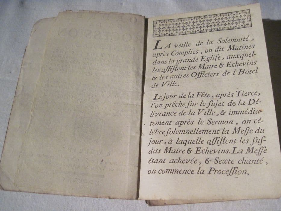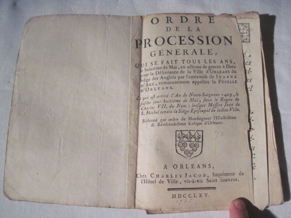 livre liturgique : Ordre de la procession générale qui se fait tous les ans le 8 mai, en action de graces à Dieu pour la délivrance de la ville d'Orléans du siège des Anglois, par l'entremise de Jeanne d'Arc, communément appelée la pucelle d'Orléans [