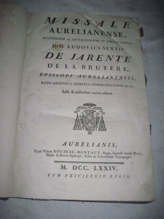livre liturgique : Missale Aurelianense, Illustrissimi Ac Reverendissimi In Christo Patris D.D. Ludovici-Sextii De Jarente De La Bruyere, Episcopi Aurelianensis, Regii Ordinis Sancti Spiritus Commendatoris, & &. Jussu Auctoritate Recens Editu. Pars Hyemalis