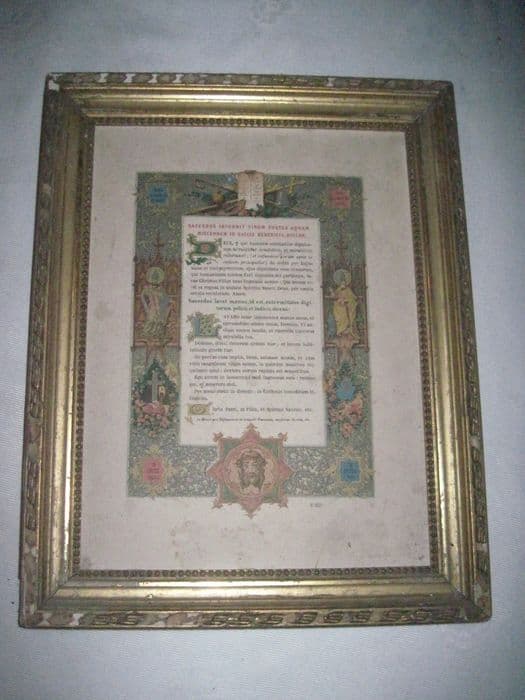Gravure en couleur en manière de texte enluminé à bordure de statues dans des niches, des instruments de la passion et de la sainte face, sur fond de fleurs. Baguette de bois doré.