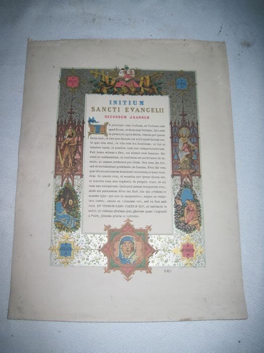 Gravure en couleur en manière de texte enluminé à bordure de statues sur des piédestaux dans des niches à lancettes, de priants, et du visage de la Vierge Marie. Dans des médaillons, inscriptions : Veillez et Priez et Vigilatate et Orate. Sans cadre.