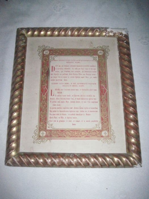 Gravure, cadre baguette dorée. Page de texte en rouge et or, bordure de rinceaux dorés sur fond rouge, cadre en baguette torsadée or.