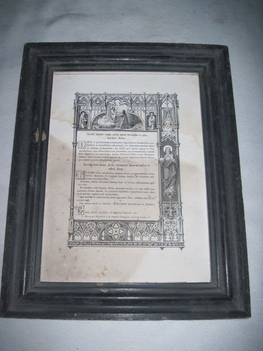 Gravure en noir, cadre noir. Le texte est présenté dans une bordure de style gothique, avec le Christ au jardin des oliviers en partie supérieure, et le Christ sauveur du monde dans une niche à droite.