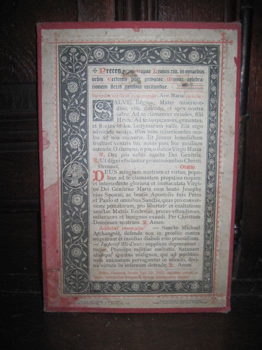 canon d'autel : Preces jussu papae Leonis XIII in omnibus orbis ecclesiis post privatae missae celebrationem flexis genibus recitandae.