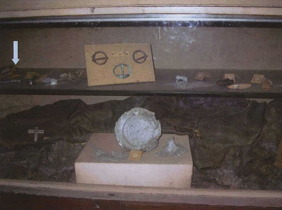 Dans la sacristie de la cathédrale, rez-de-chaussée, 2e salle, placards n° 9-10 bas, vitrine iférieure consacrée aux fouilles archéologiques de 1937.