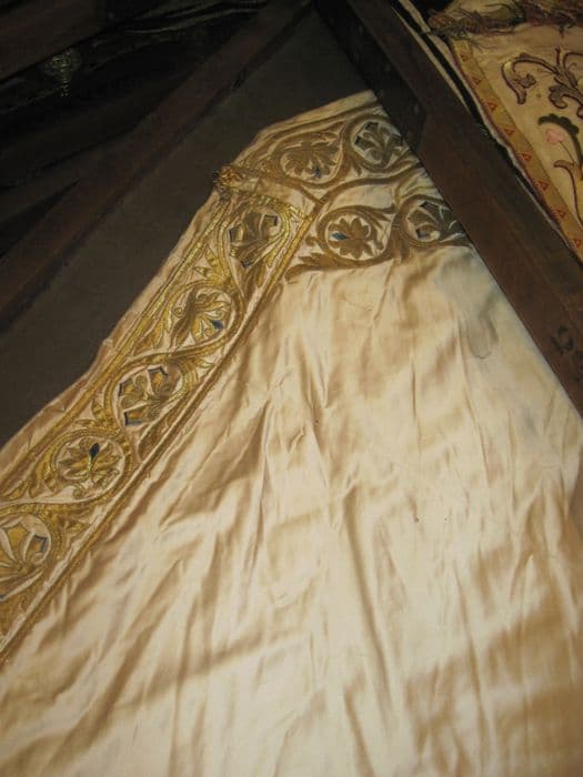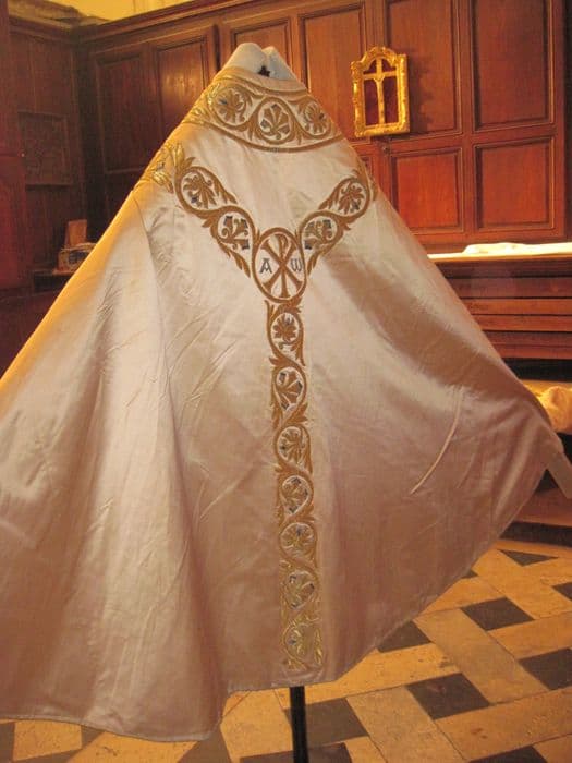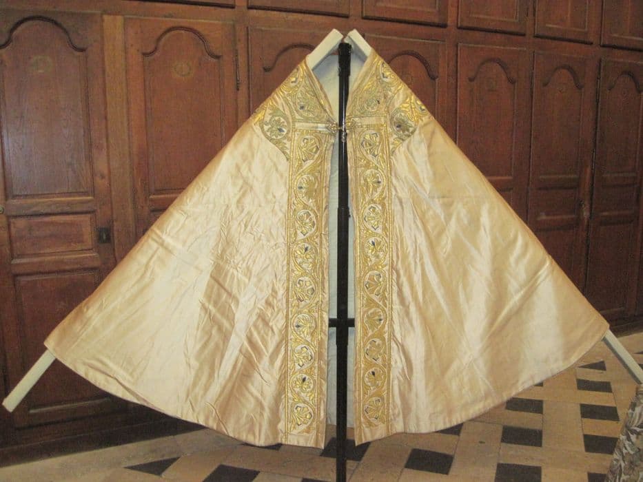 Chape en soie crème, fin orfrois à motifs de rinceaux feuillagés brodés à fil métallique or et fil bleu. Au revers, le chrisme dans un médaillon.