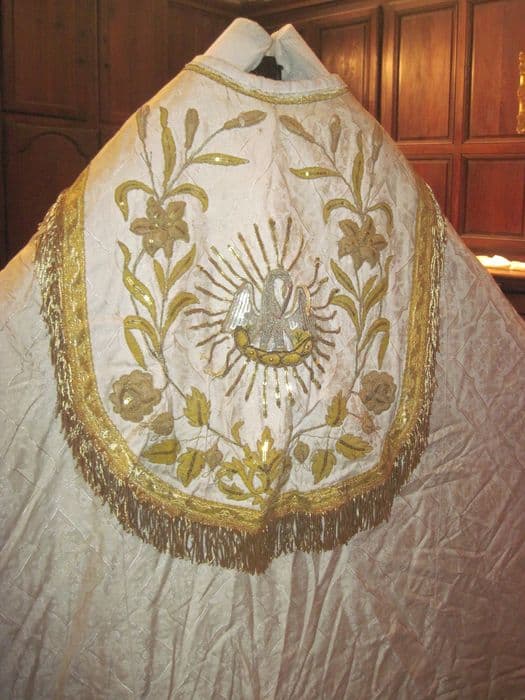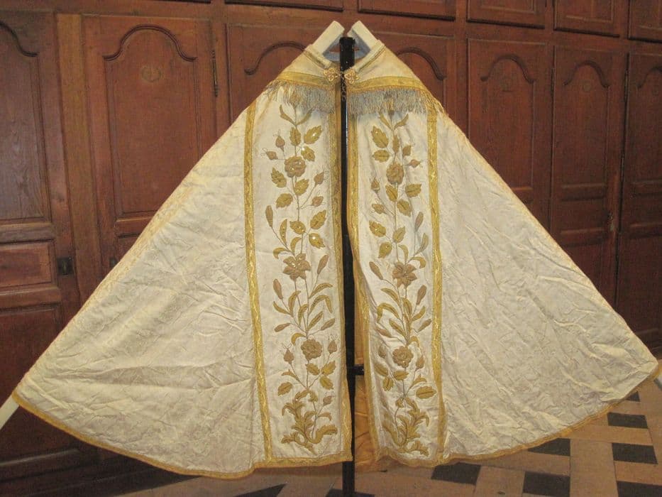 Chape en soie crème, damassée à motifs de fleurons dans un réseau ; galon système or ; orfroi broderie guipure de chutes de fleurs ; chaperon brodé en guipure du pélican nourrissant ses petits de son sang. Colletin