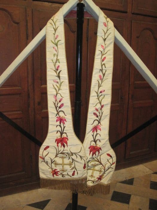 Etole en soie crème, frangée et bordée d'un galon torsadé or ; broderie de guirlande de fleurs polychromes (lys) et de deux croix ansées perlées et incrustées de cabochons roses. Colletin de gaze légère.