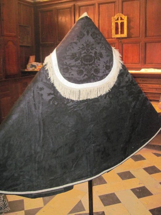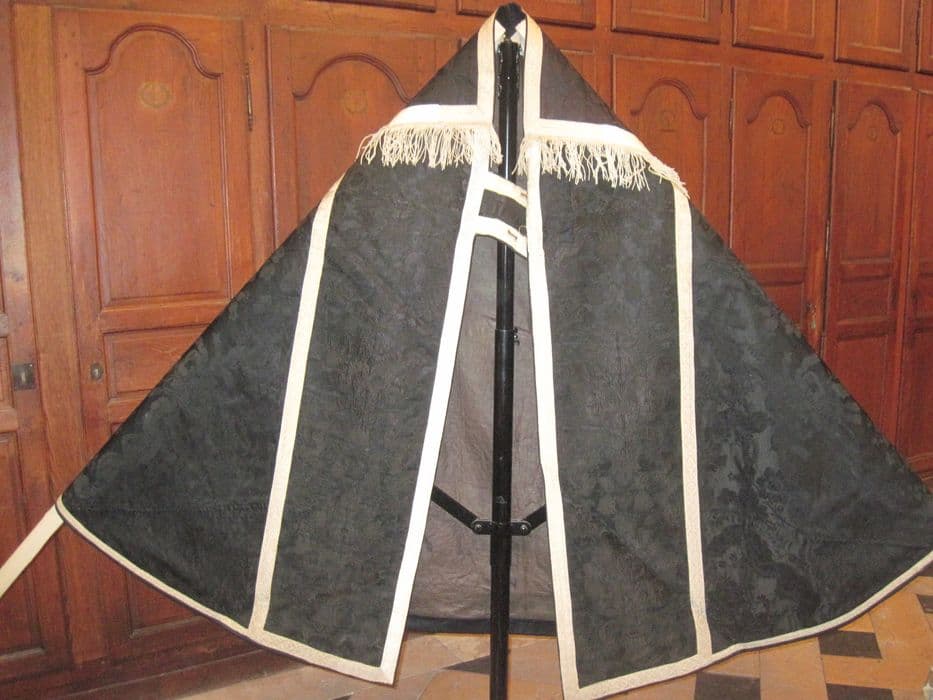 Chape de deuil à fond damassé et lampas constitué de remploi de tissus anciens reteints ; galon système blanc cassé et chaperon frangé.