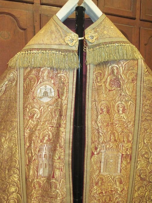 Soie, fils d'argent doré, laiton doré et émaux (fermail). Chape de la chapelle de Mgr Coullié, entièrement brochée de fils d'argent doré. Le fermail quadrilobé est orné d'une croix grecque émaillée. Doublure en soie rouge.
