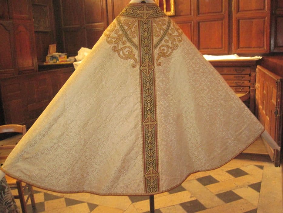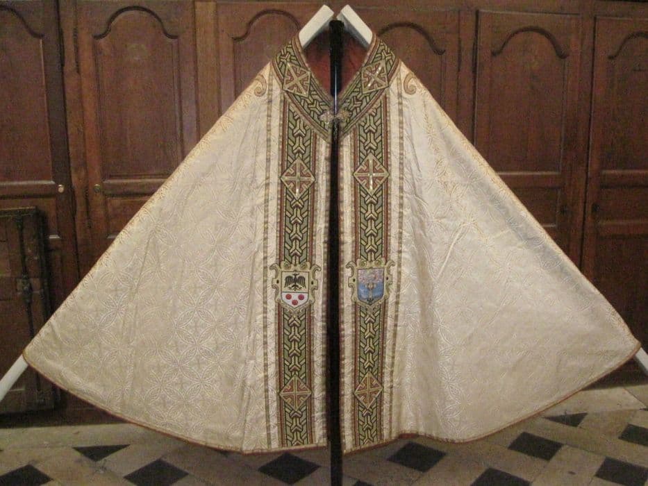Chape de soie crème à fond damassé de croix dans des rosaces feuillagées ; galon système or ; orfrois brodés de motifs géométriques rouge, noir, et fils métalliques or, rebrodés à mi-hauteur d'écussons (un aigle et des boules rouges ; la croix et les instruments de la Passion surmontés de la main bénissantes surgissant des nuées, en peinture à l'aiguille).