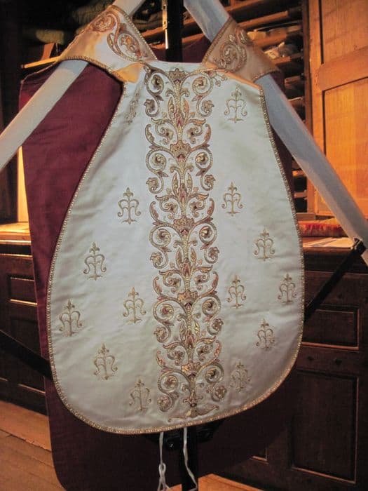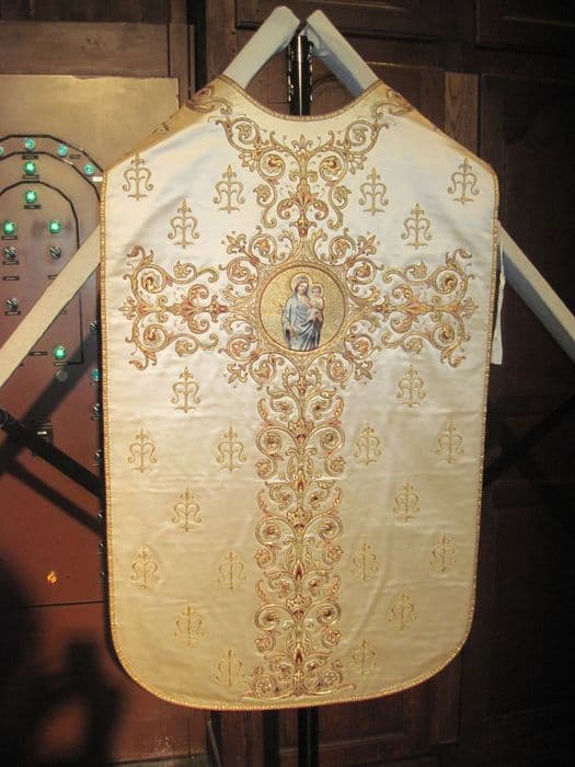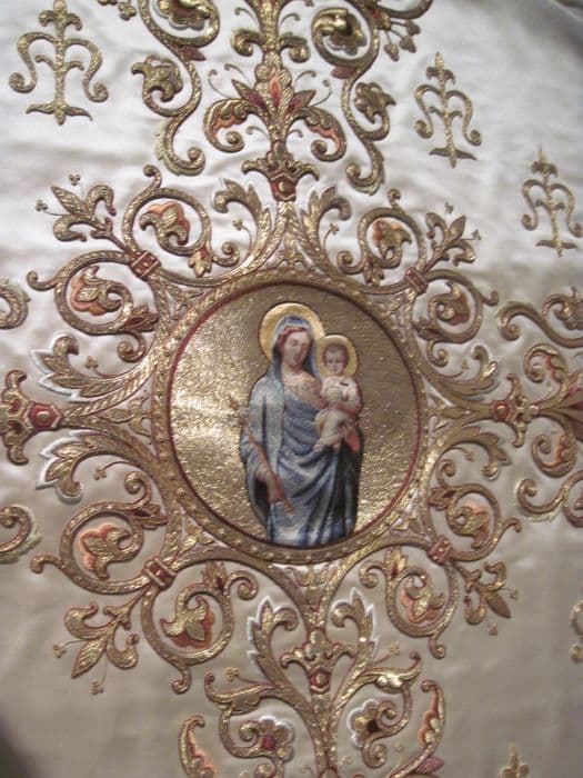 Chasuble fond soie crème, galon système or, broderie guipure fils métalliques rouge et or au passé empiétant, perles. Au centre de la chasuble, la Vierge à l'enfant en peinture à l'aiguille polychrome. Ensemble conservé dans sa boîte en bois
