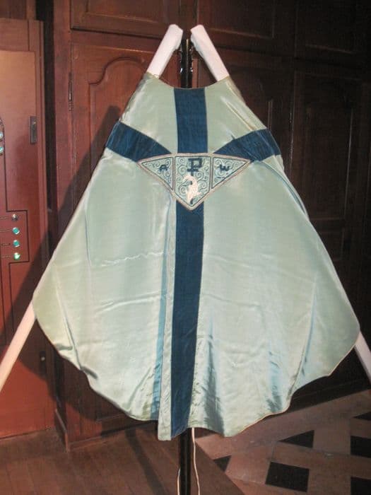 Tissu synthétique. Chape en tissu synthétique vert d'eau, galon velours vert foncé motif de poisson brodé à la face, sur fond de triangle à rinceaux portant les lettres A P W,et de colombe au revers.