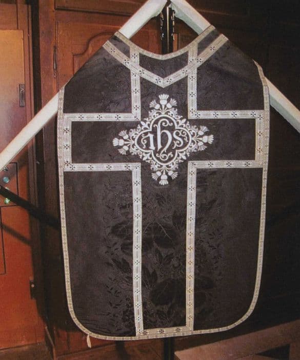 Chasuble de deuil, fond satin brodé de feuillages au naturel, au centre quadrilobe frappé du monogramme IHS et galons système argent néogothiques à motif de frise de losanges.