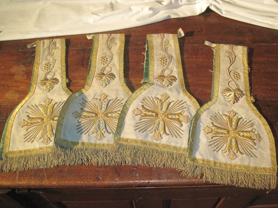 Soie, fils métalliques, perles métalliques. 4 manipules identiques fond tissu métal, broderies guipure or serties de violet à motifs de pampres de vigne, petits miroirs métalliques incrustés, croix guipure sur les pales, galon or.
