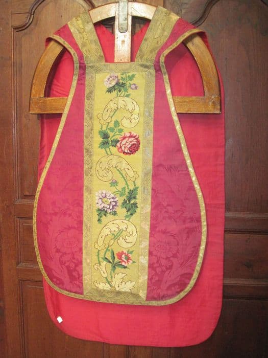 Chasuble d'une chapelle (cf. 0.247 et 0.253) : fond damas à la grenade, croix en lampas de fleurs au naturel, feuillages et grappes de raisins, parements brochés de rosiers au naturel, un galon or.