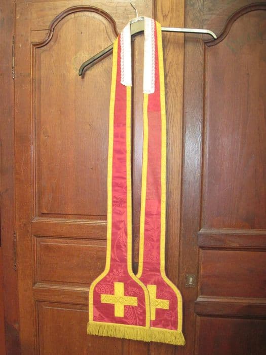 Etole fond damas à la grenade, croix en galon jaune rapporté, colletin.