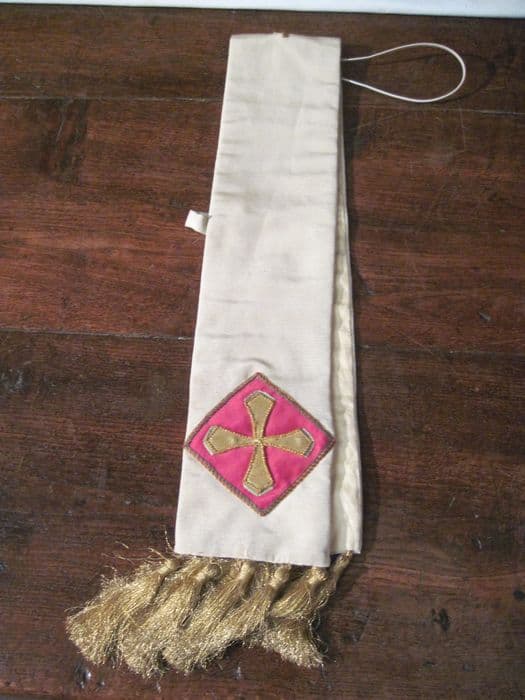 Manipule fond crème, à motif rapporté de croix fils or dans un losange de tissu rose. Pompons or.