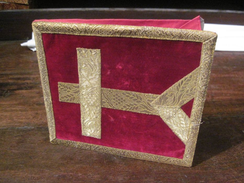 Bourse fond velours cramoisi à motif de croix rapportée en galon or.